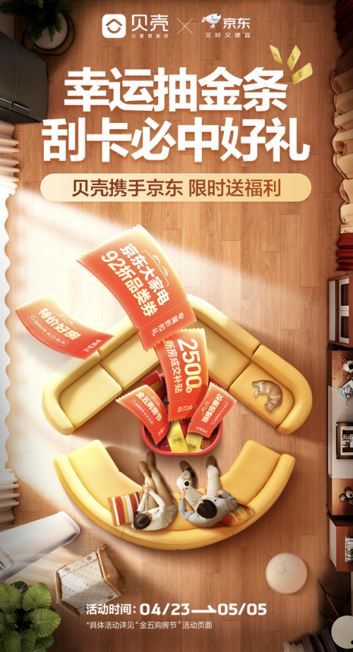 近日,京东家电家居携手贝壳“金五购房节”一起送福利,为消费者提供“购房+家电”一站式安家优惠解决方案。活动期间,消费者在贝壳平台购买新房,不仅可以享受贝壳提供的2500元新房成交补贴,还可在4月28日24点前,在贝壳APP和京东APP领取京东提供的92折专属优惠券。